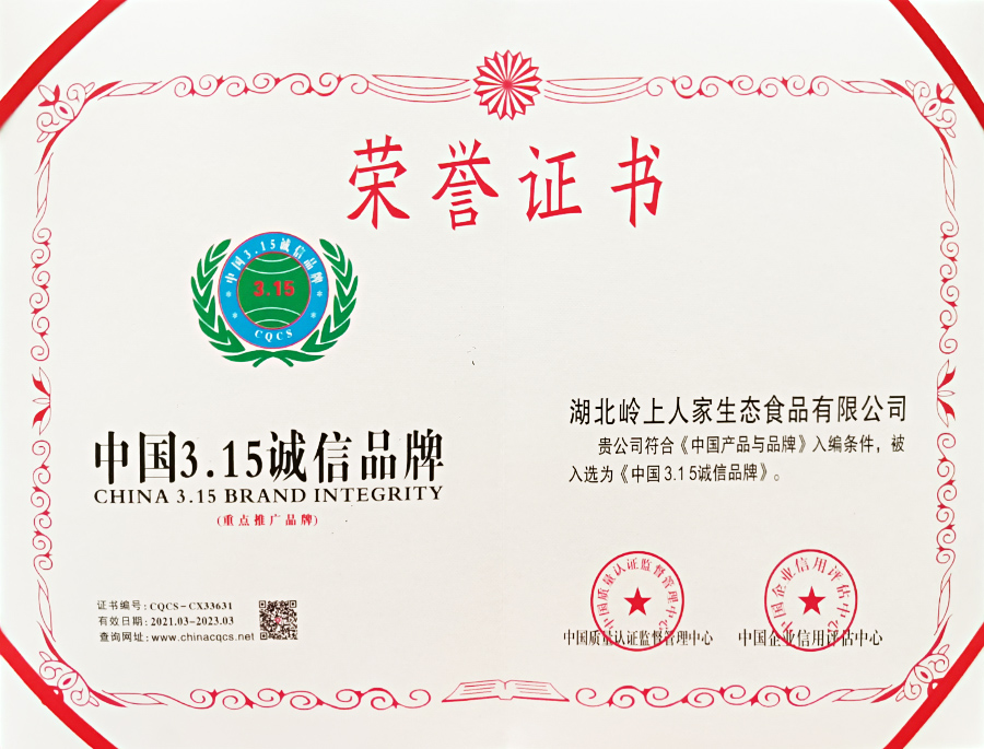 中國3·15誠信品牌榮譽(yù)證書