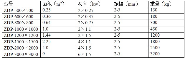 注:此表為上、下振形式振動平臺技術(shù)參數(shù),僅供參考;此外可以根據(jù)用戶實際使用需要定做臺面大小來選用振動電機數(shù)量及功率。