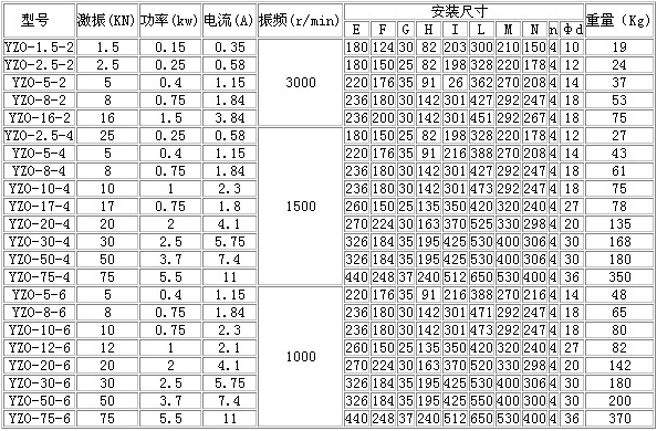 YZO系列振動電機技術(shù)參數(shù)